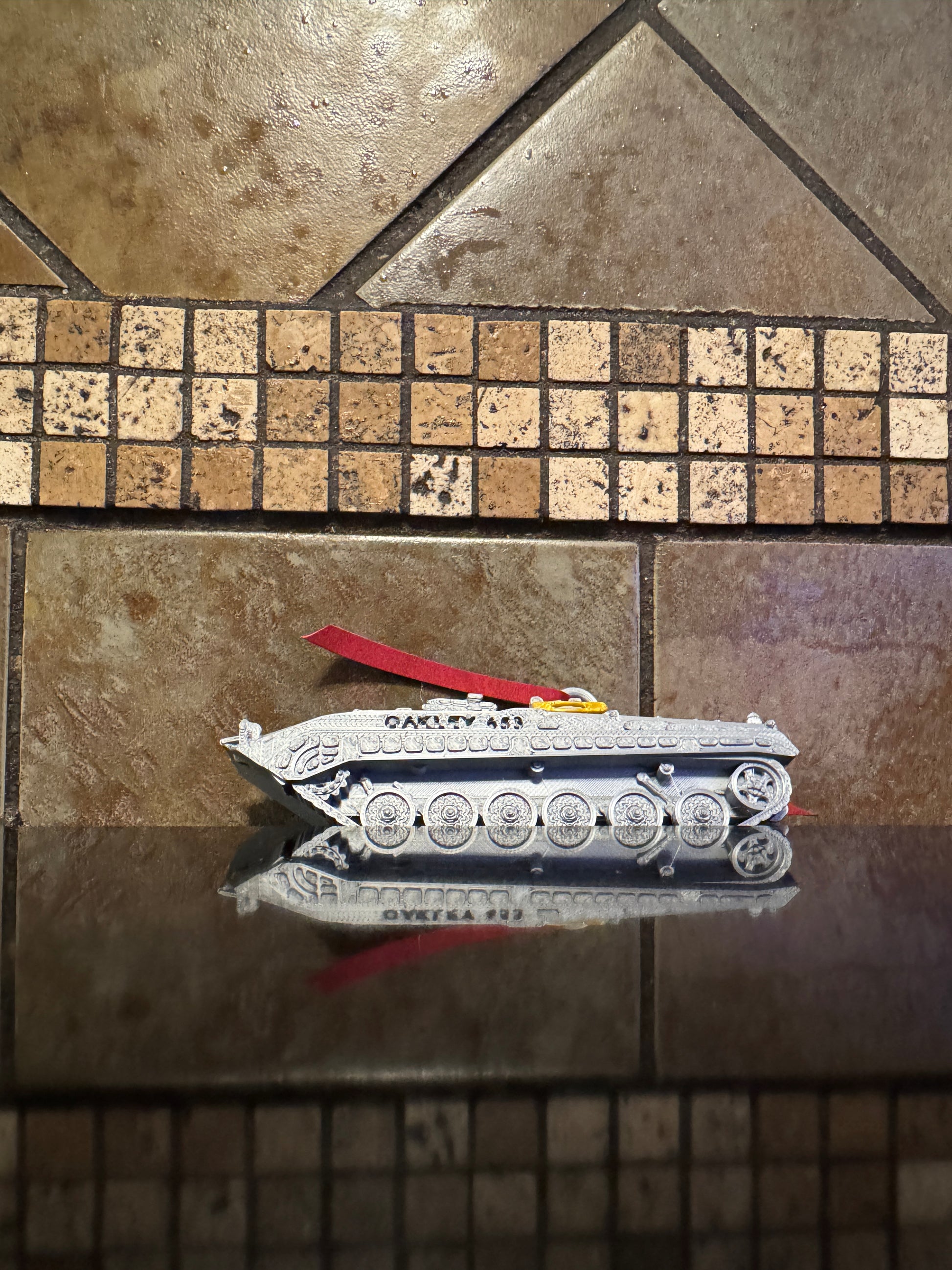 Add some Oakley-inspired flair to your holiday décor with this 3D printed Tank Christmas Tree Ornament!