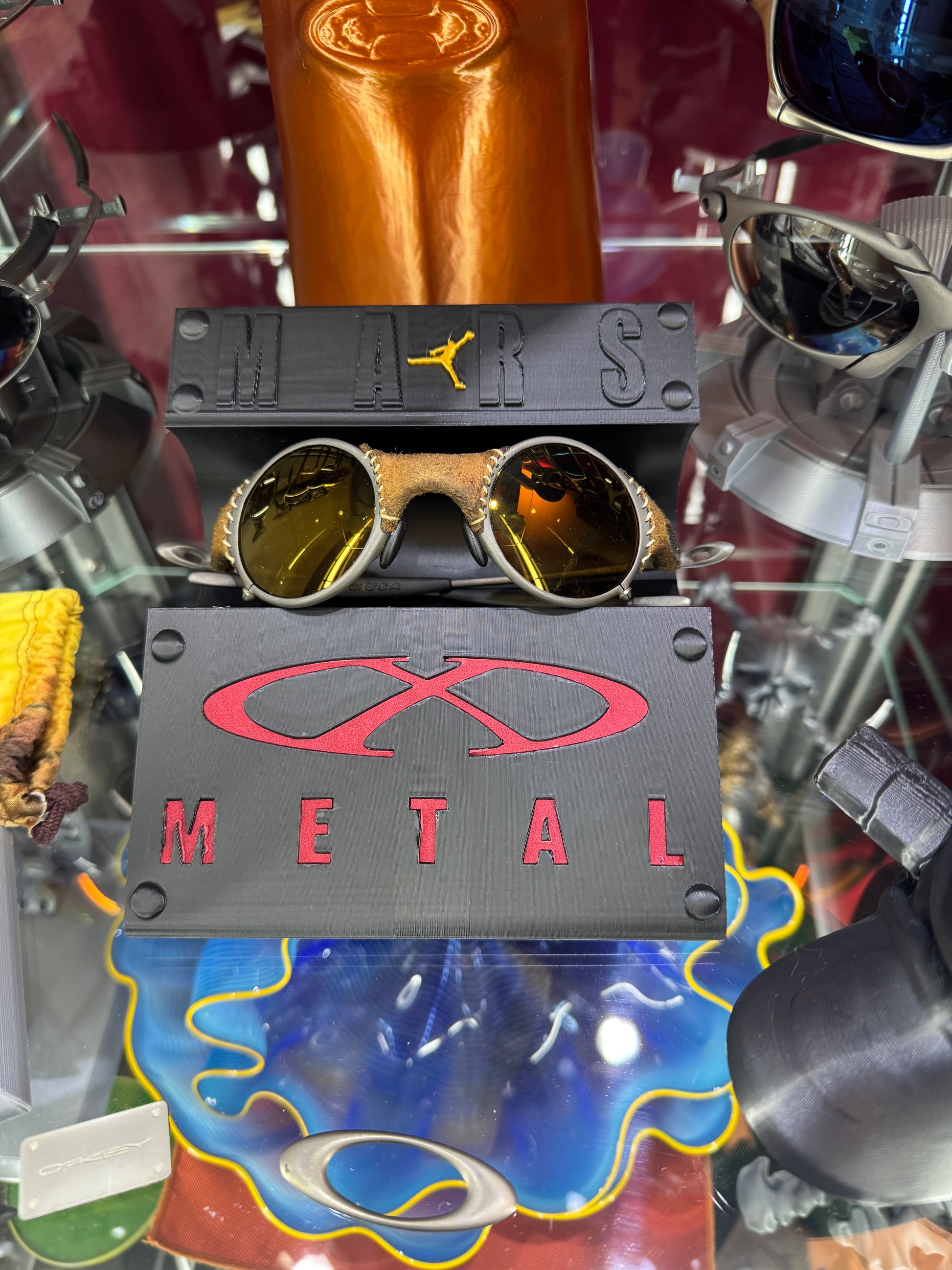 Oaklie Mars Display Stand with Red Leather X-Metal Logo Insert Jordan Logo
