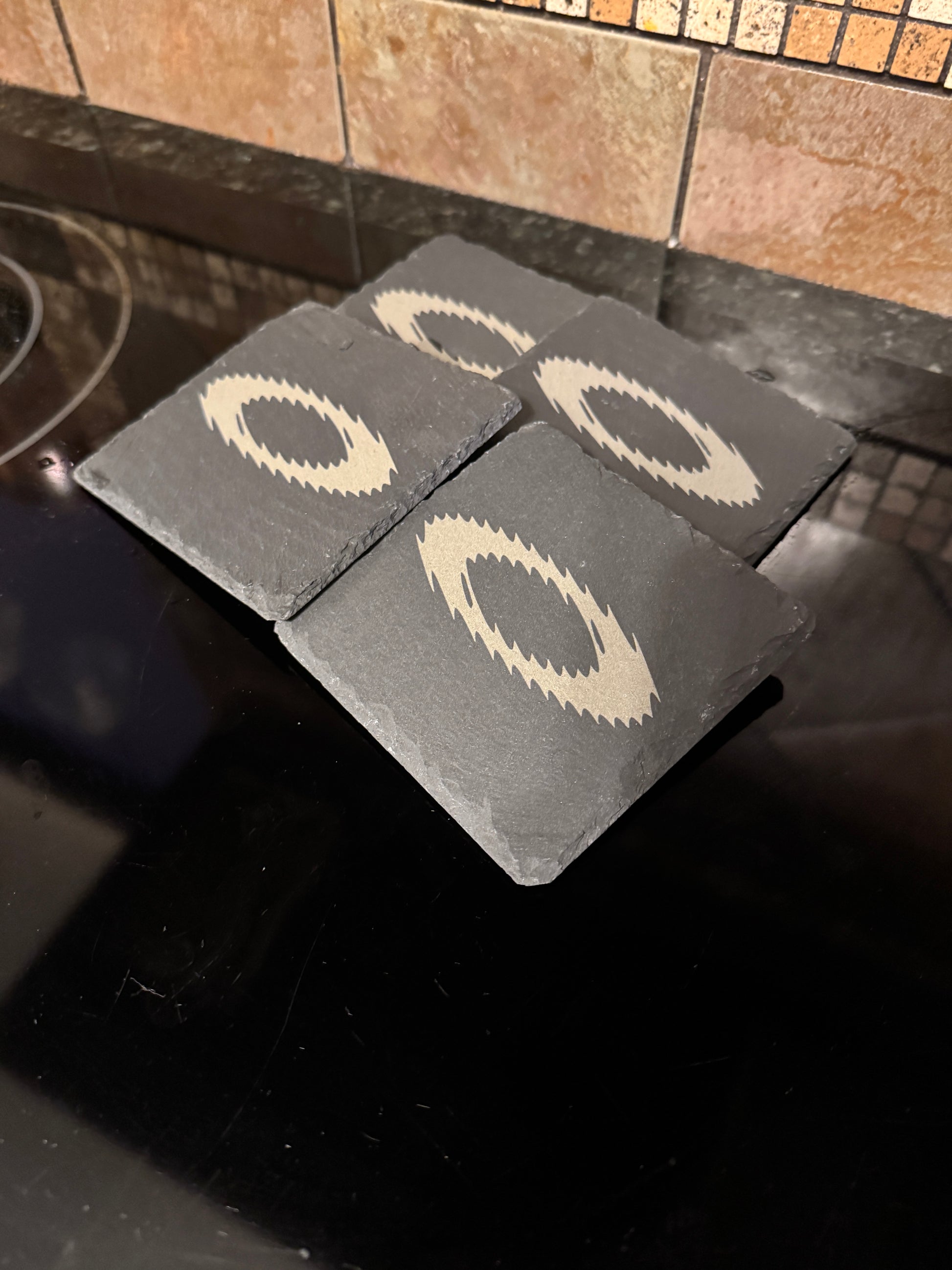 Description: Upgrade your space with this set of 4 Slate Oaklie Logo Coasters “Hydra Pad.” Crafted with a bold, rugged look and measuring 4" in diameter, these coasters deliver both functionality and a mad science-inspired Oaklie aesthetic.