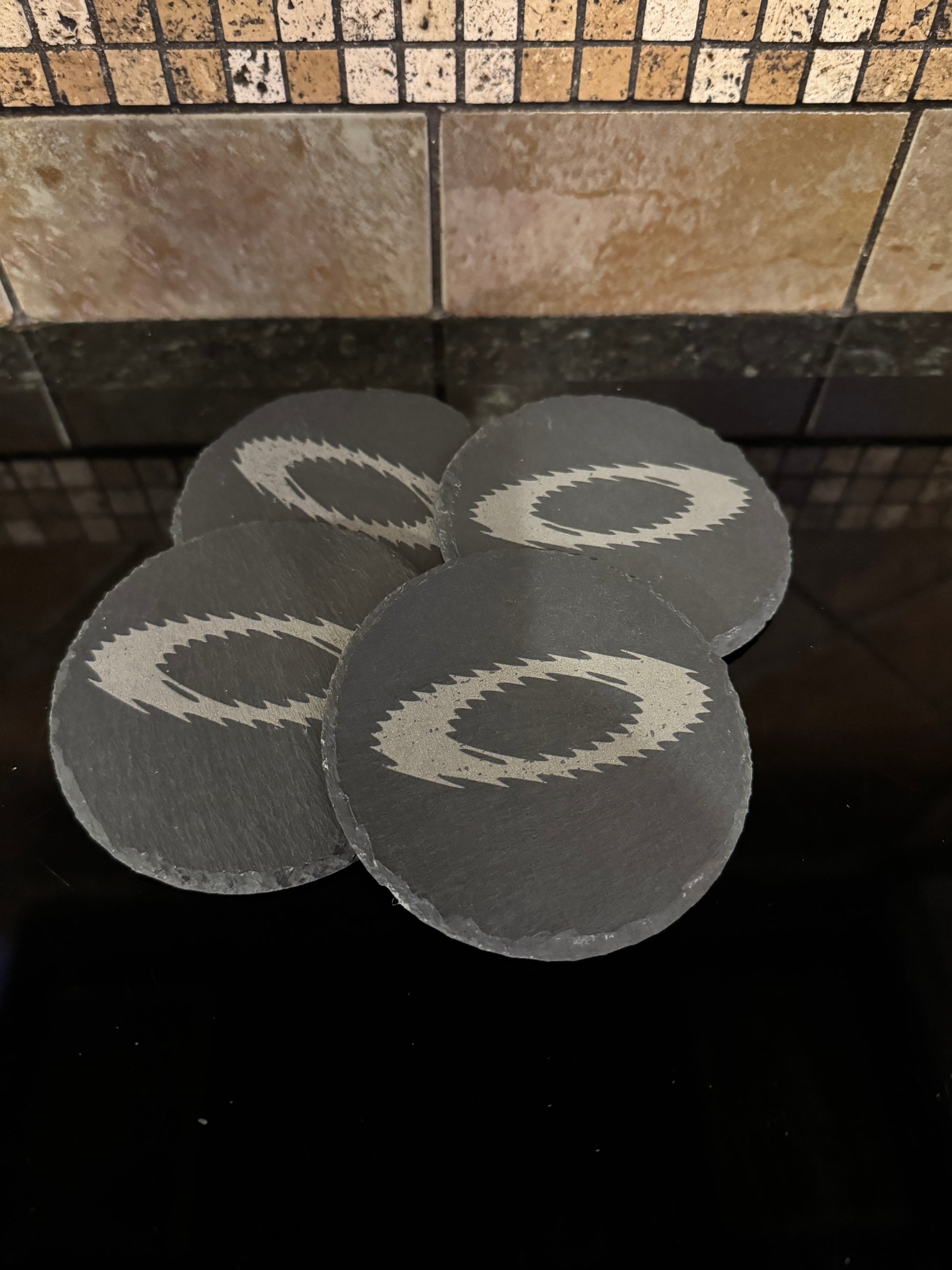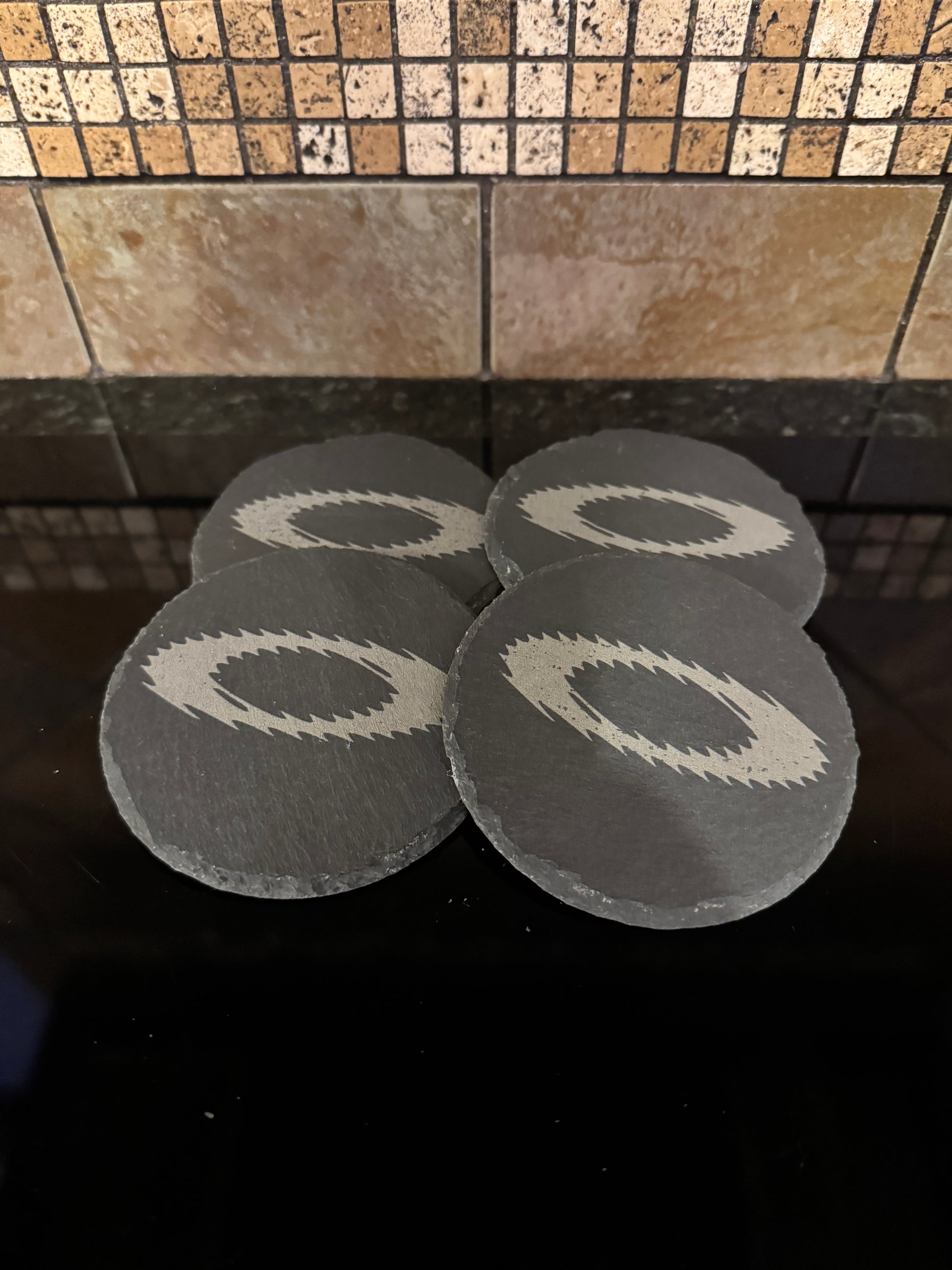 Description: Upgrade your space with this set of 4 Slate Oaklie Logo Coasters “Hydra Pad.” Crafted with a bold, rugged look and measuring 4" in diameter, these coasters deliver both functionality and a mad science-inspired Oaklie aesthetic.